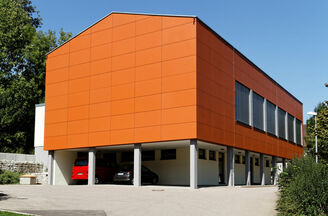 `Stadthaus Trossingen´, Fassadensanierung mit Fundermax 6 mm, Farbe grau 0075